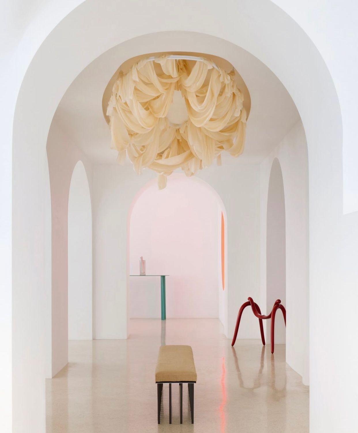 L'appartement / galerie de plusieurs centaines de mètres carrés se tient dans un immeuble parisien construit en 1908 par Raymond Barbaud et Edouard Bauhain orné en façade d'un bas-relief / cadran solaire de Jules Rispal de style "art nouveau". Dans mon travail je tiens toujours à m'inscrire dans le lieu et son histoire. J'ai donc cherché à transposer les codes de l'art de nouveau dans le projet tout en lui donnant une signature contemporaine. Antoni Gaudi a été ma première référence : le plus maximaliste des architectes de l'époque. Partant de ce point j'ai ramené l'esprit du lieu d'une part - moins ostentatoire - et de l'œuvre de James Turrell d'autre part - ultra contemporaine, tout cela mélangé avec des évocations d'architectures religieuses.